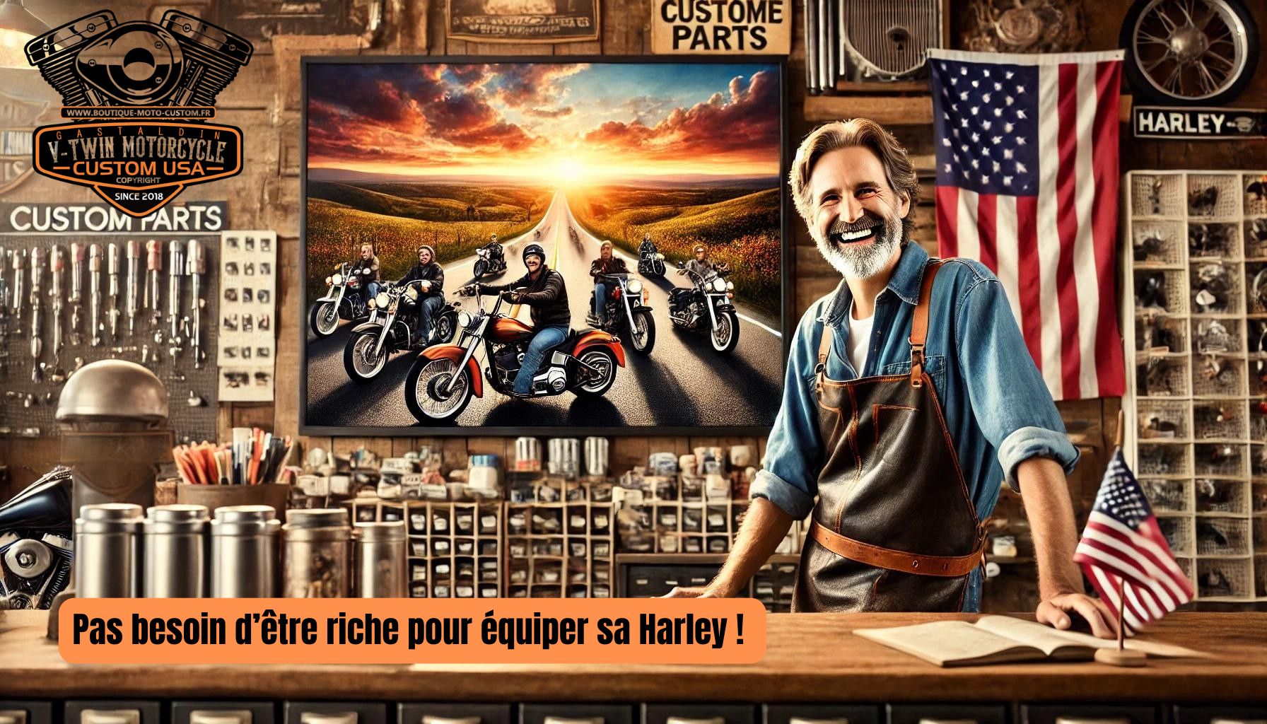 Nous proposons une large gamme de pièces pour Harley Davidson (Dyna, Sportster, Touring, Softail) rigoureusement sélectionnées pour leur qualité. Pas besoin d’être riche pour personnaliser votre moto et vivre votre passion !